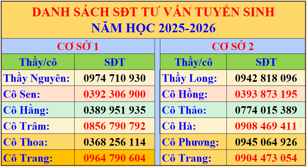 0908 469 411 (Cô Hà) – 0347 911 795 (Cô Phương)