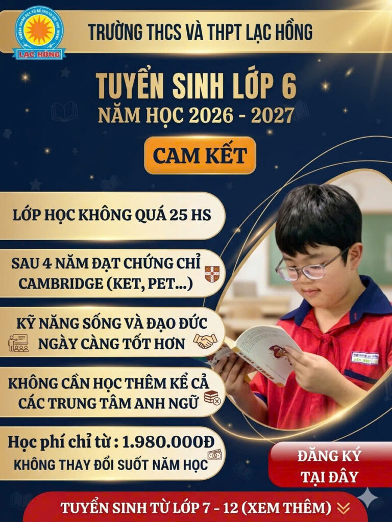 Bước vào lớp 6 là cột mốc quan trọng trong hành trình học tập của học sinh. Hiểu rõ điều đó, Trường THCS & THPT Lạc Hồng chính thức triển khai tuyển sinh lớp 6 năm học 2026–2027 với chương trình đào tạo toàn diện, chú trọng ngoại ngữ – kỹ năng – đạo đức.